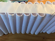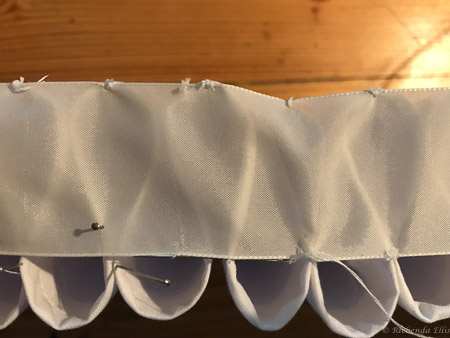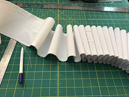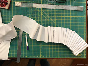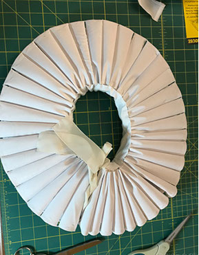 Now to the Elizabethan ruff. It took over TEN FEET of fabric!! I covered a piece of pellam with white cotton fabric and machine embroidered the edge. I then had to run gathering threads through the strip of stiffened fabric to create the 'ruffles'. Each 'ruffle' had to be stitched at the top and bottom to a piece of fabric that made the neck surround. Once all the gathers were secured inside I then had to stitch the outer edge of the ruffles to create the classic look.
