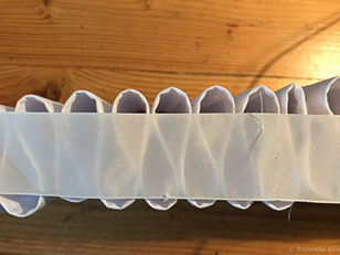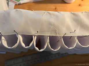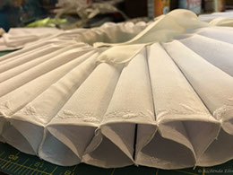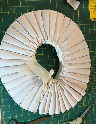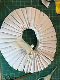 Now to the Elizabethan ruff. It took over TEN FEET of fabric!! I covered a piece of pellam with white cotton fabric and machine embroidered the edge. I then had to run gathering threads through the strip of stiffened fabric to create the 'ruffles'. Each 'ruffle' had to be stitched at the top and bottom to a piece of fabric that made the neck surround. Once all the gathers were secured inside I then had to stitch the outer edge of the ruffles to create the classic look.